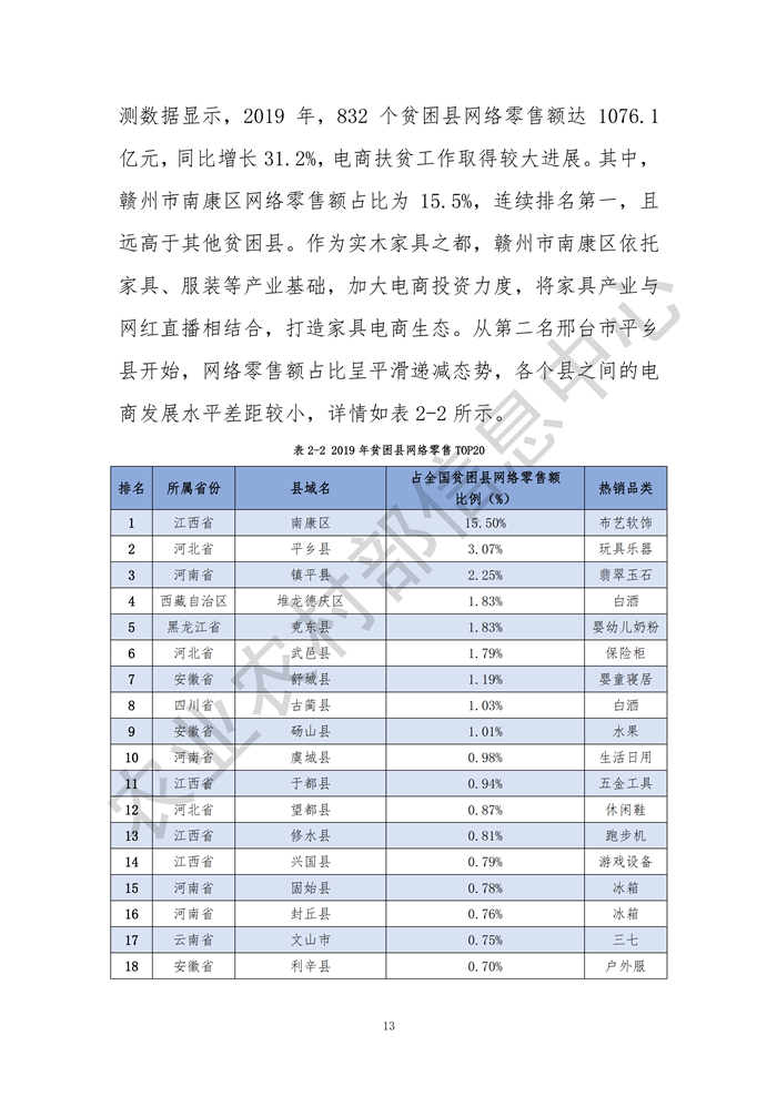 發(fā)布會(huì)指出,2019年全國2083個(gè)縣域網(wǎng)絡(luò)零售額達(dá)30961.6億元,同比增長23.5%,其中832個(gè)貧困縣網(wǎng)絡(luò)零售額達(dá)1076.1億元,同比增長31.2%;縣域農(nóng)產(chǎn)品網(wǎng)絡(luò)零售額達(dá)2693.1億元,同比增長28.5%,其中832個(gè)貧困縣農(nóng)產(chǎn)品網(wǎng)絡(luò)零售額為190.8億元,同比增長23.9%,需求側(cè)的數(shù)據(jù)、信息日益成為供給側(cè)結(jié)構(gòu)性改革的新動(dòng)能,農(nóng)業(yè)的產(chǎn)業(yè)鏈、供應(yīng)鏈、創(chuàng)新鏈、價(jià)值鏈正在加速重構(gòu),電子商務(wù)成為“綠水青山就是金山銀山”的重要“轉(zhuǎn)換器”。
